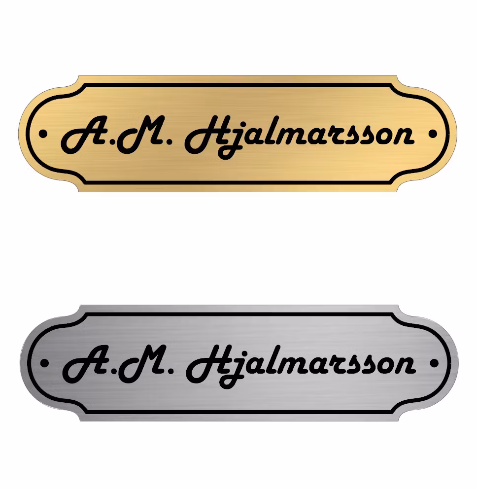 Hem › Dörrskyltar › Skylt Plast Gravyr ! Skylt Plast Gravyr ! I lager. 0 kr 100 kr Färg Guld Silver Storlek 150x40 200x55 Font nr.1 nr.2 nr.3 nr.4 nr.5 Köp Antal i lager: Tjocklek 1,6 mmMaterial: Plast – Reptålig,Metallic Guld Borstat och Metallic Silver BorstatUV-tåligLasergravyr skyltskruvmontering eller dubbelsidig tejp. ingår ej Flera populära produkter Skylt Toallet Plast Gravyr ! 120 kr Läs mer Köp Skylt Omklädning herr 100 kr Läs mer Skylt Omklädning dam 100 kr Läs mer Skylt Lunchrum 100 kr Läs mer