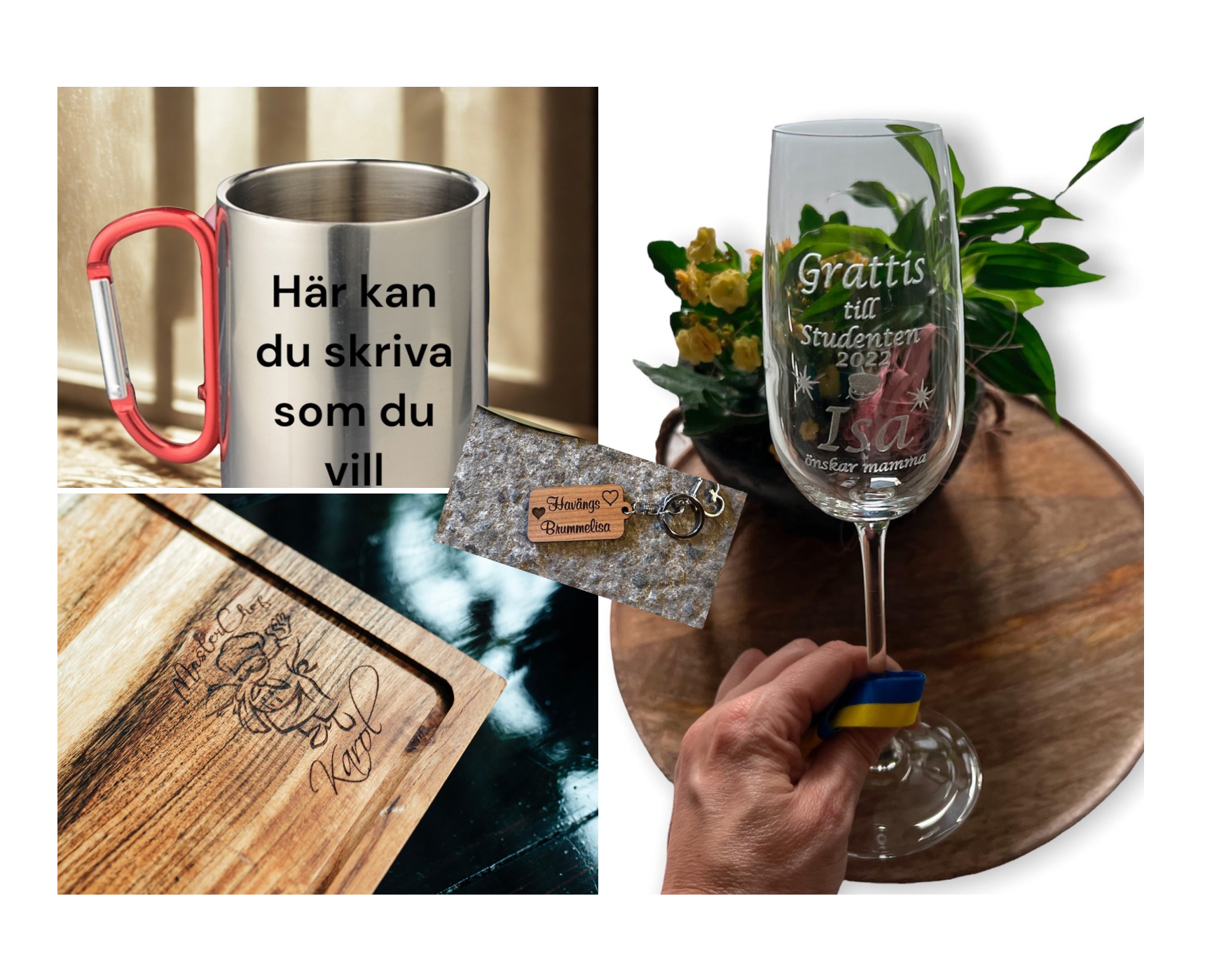 **”Välkommen till våra personliga favoriter! Här kan du skapa något helt unikt genom att lägga till egen text, datum eller bilder på muggar, väskor, nyckelringar, glas och skärbrädor.