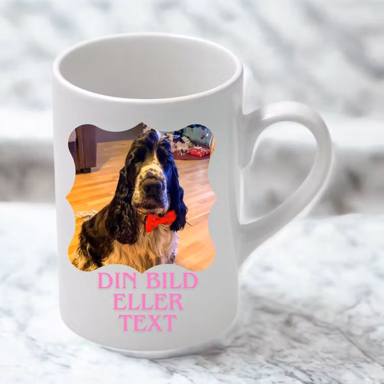 - Du kan ladda upp en bild eller text, sen kan vi anpassa dem till muggen och skicka exemplet till dig så kan du säga vad du tycker.