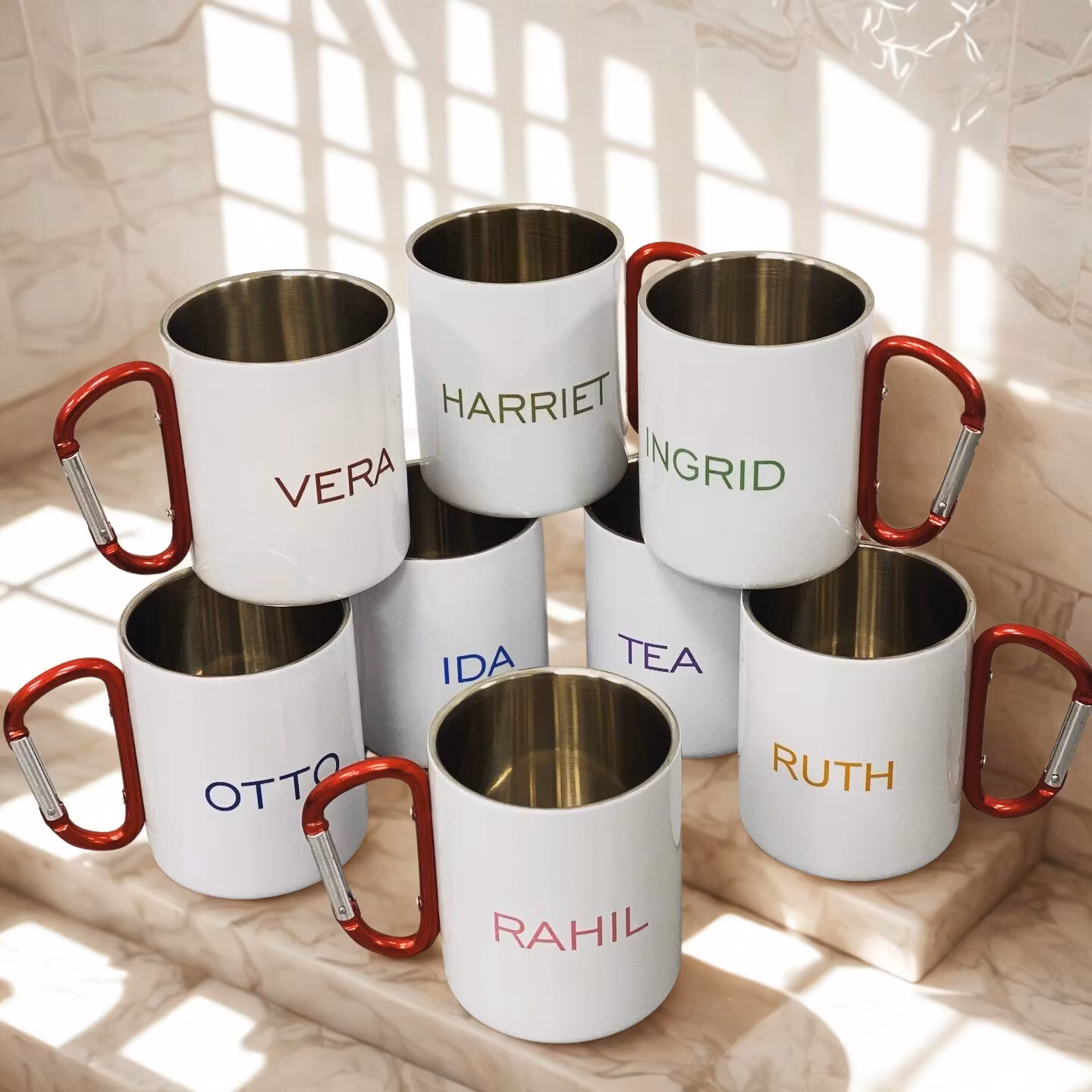 Muggen är gjord av hållbar rostfri stål och karbinhaken gör det enkelt att fästa muggen på ryggsäcken, bältet eller annan utrustning när du är på språng.