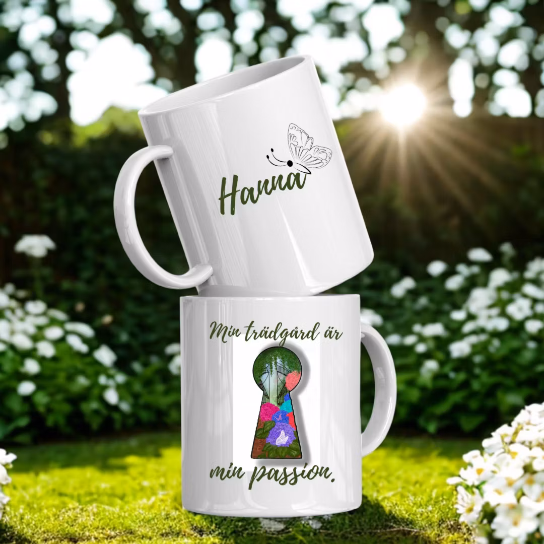 Fira trädgårdens magi med denna unika och personliga mugg!