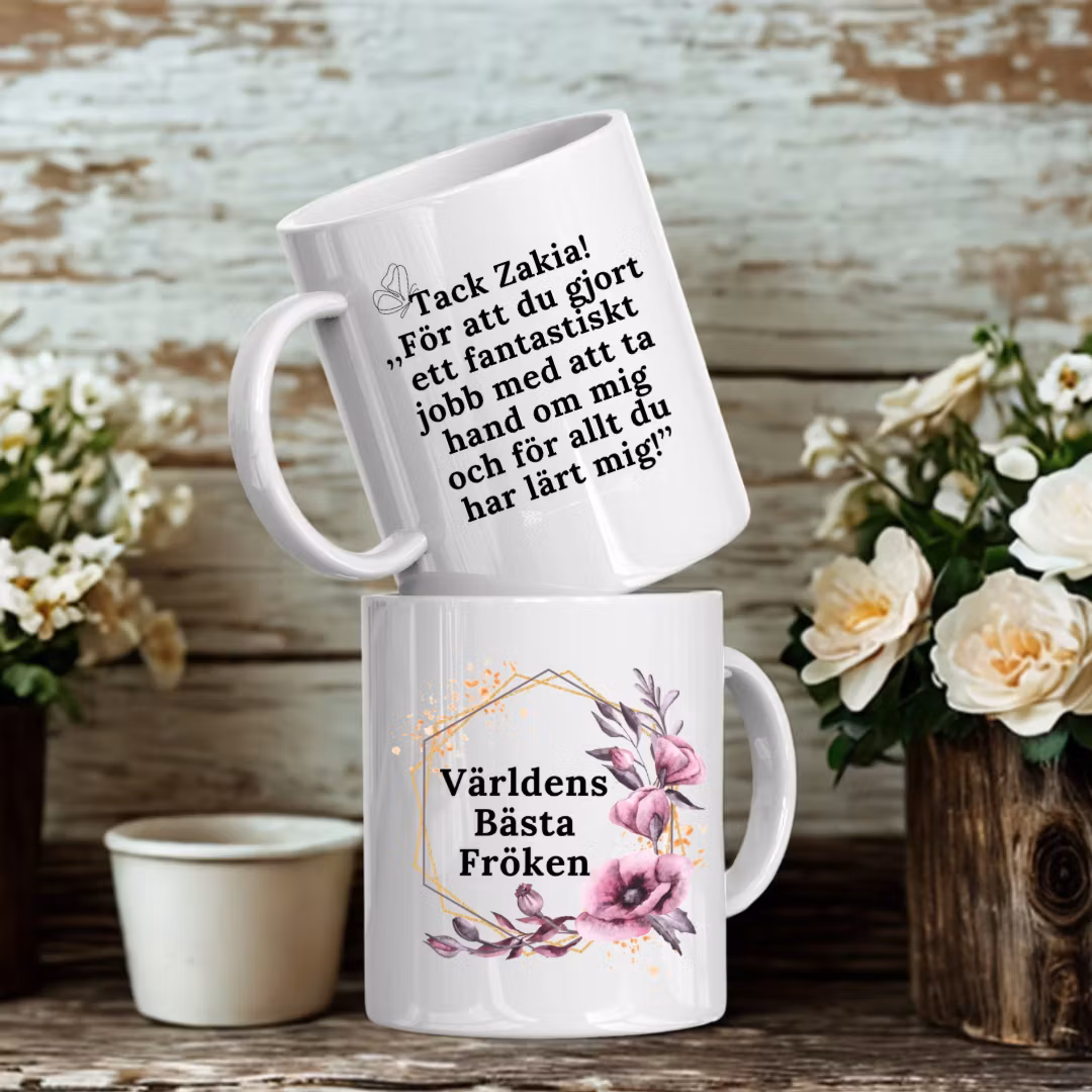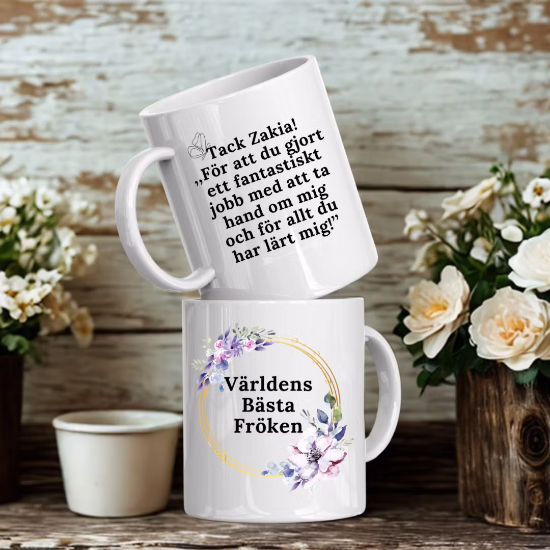 💌 Den här muggen har en färdig hjärtlig dedikation, där du enkelt kan lägga till lärarens namn. Det blir en omtänksam och minnesvärd present som visar uppskattning på ett personligt sätt – något varje lärare verkligen värdesätter.