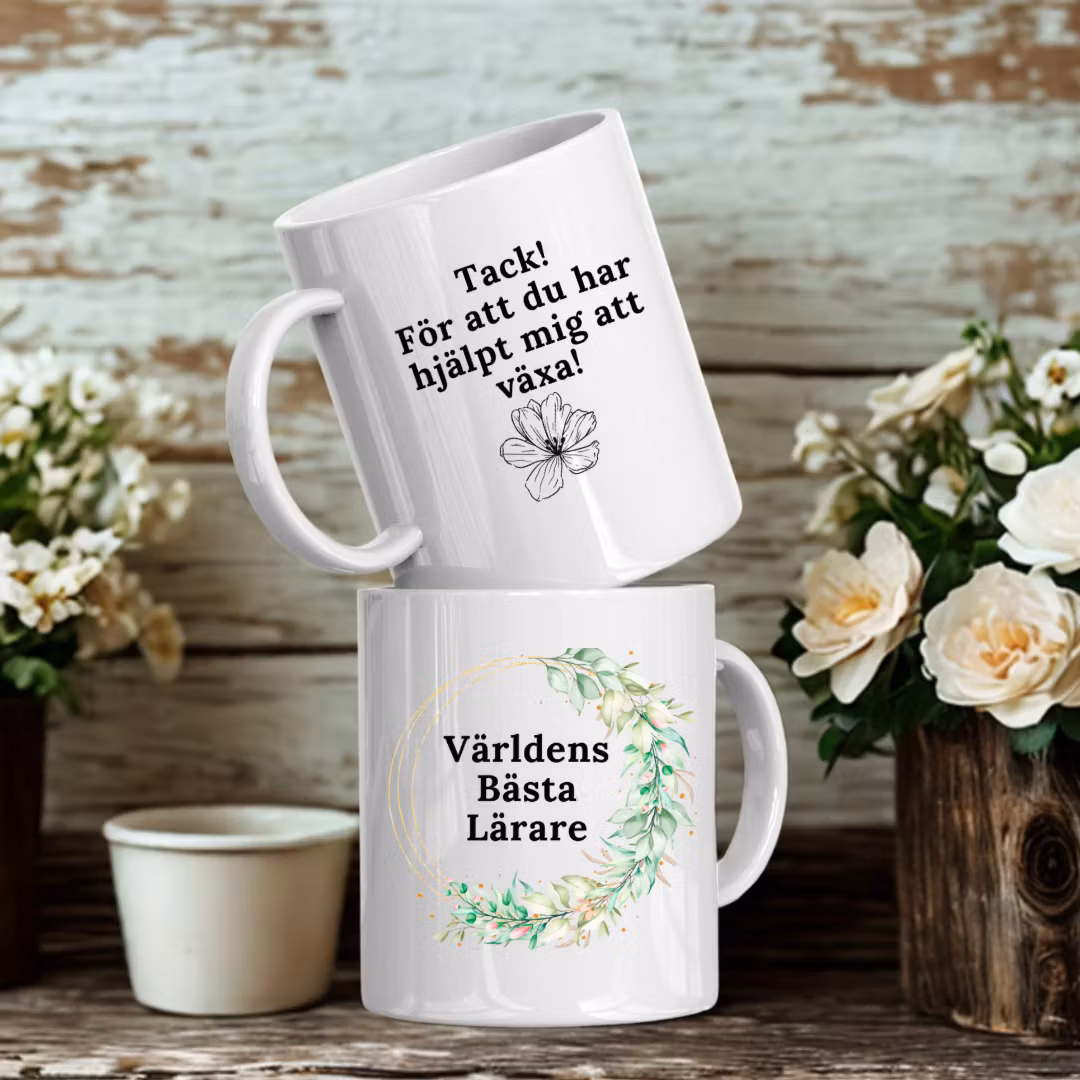 En elegant mugg med texten “Världens bästa lärare” eller “fröken”, inramad med en stilren ram med bladmotiv som ger en lyxig och varm känsla.