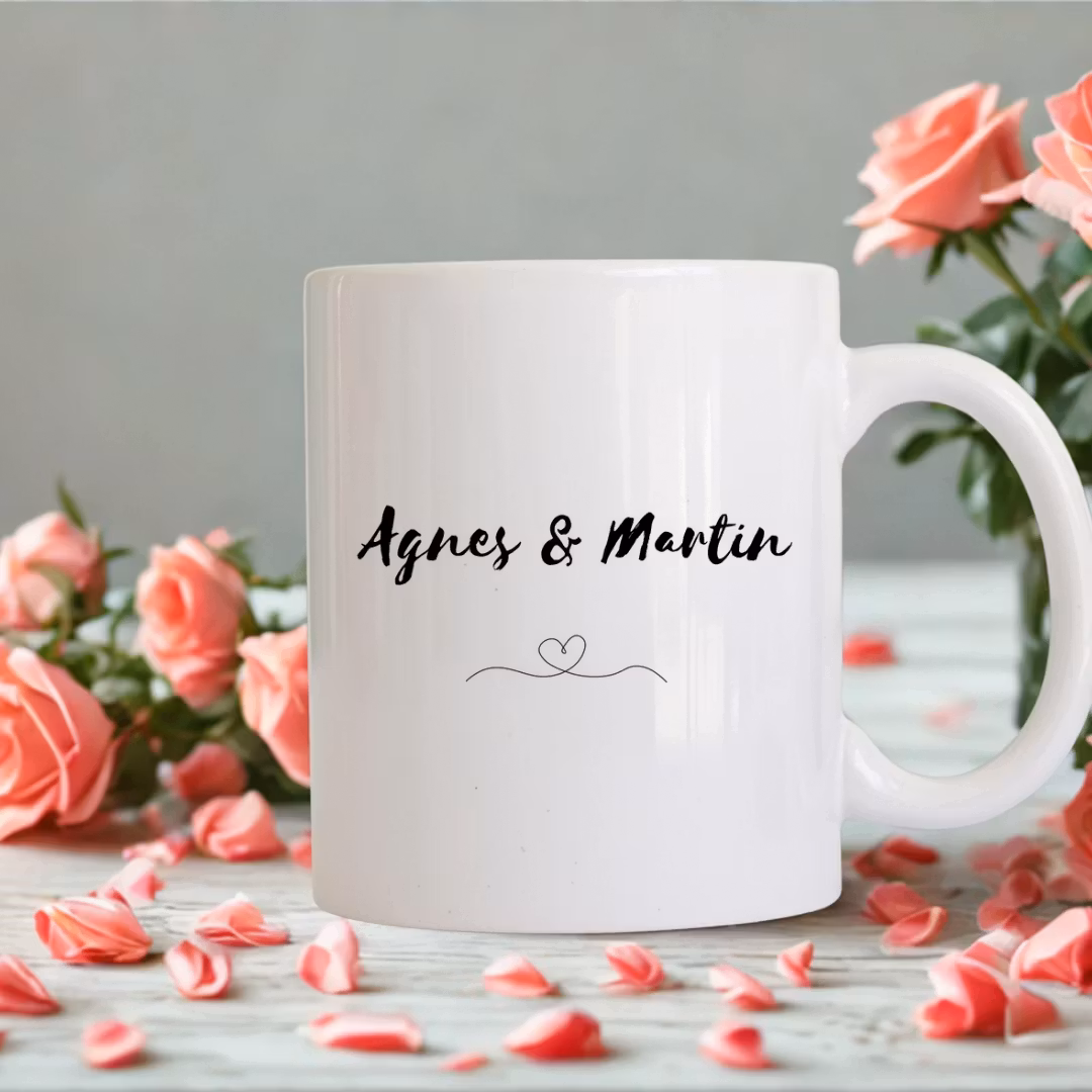 På baksidan kan du lägga till parets namn, t.ex. ”Agnes & Martin”, med en linje som övergår i ett hjärta 💖 under namnen.