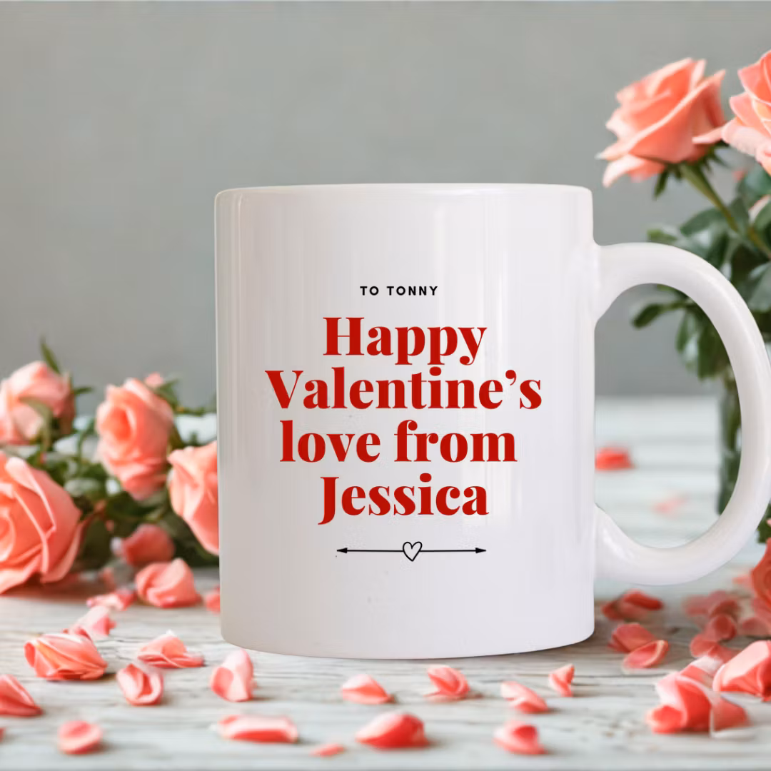 325 ml mugg som kan personaliseras! På framsidan finns ett stort rött hjärta ❤️ med svart text: ”Will you be my Valentine, [ange namn]?”.