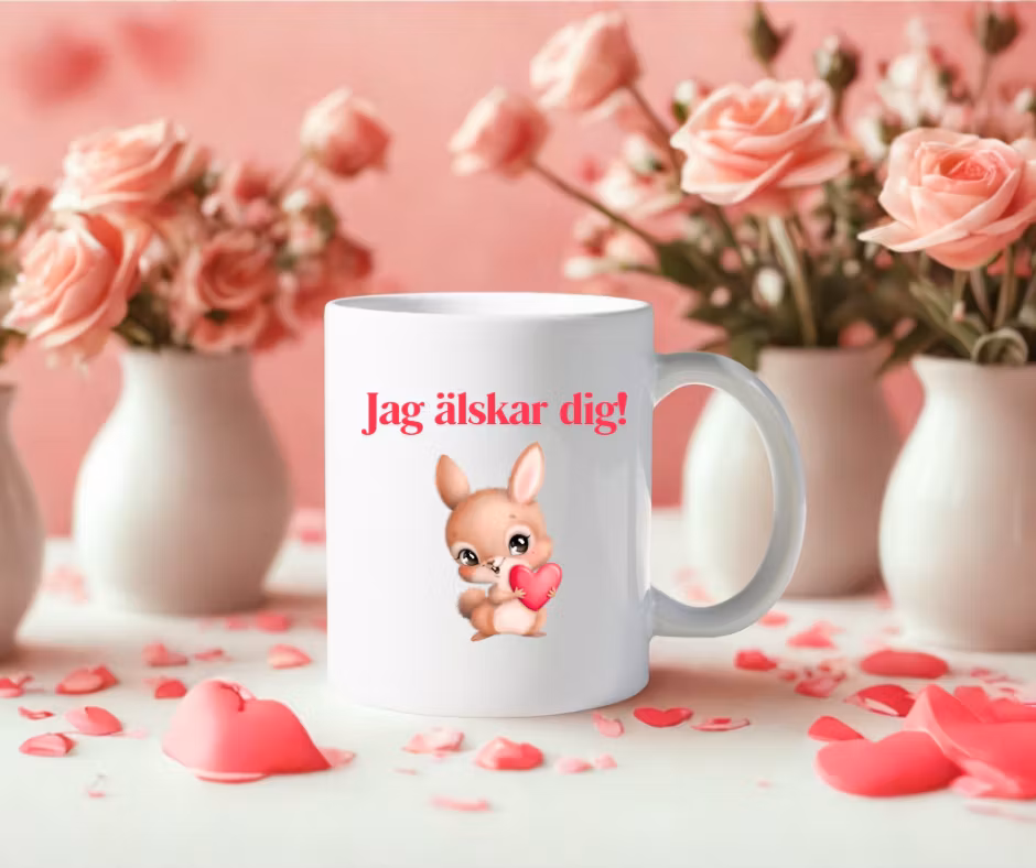 325 ml mugg som kan personaliseras! På framsidan står texten ”Jag älskar dig!” med en söt kanin som håller ett hjärta 🐰❤️.